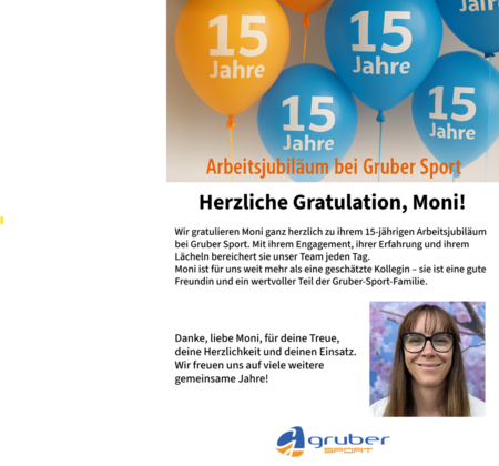Liebe Moni, wir danken dir von Herzen für deine Treue, deine Begeisterung und deinen Beitrag, der Gruber Sport jeden Tag ein Stück besser macht.